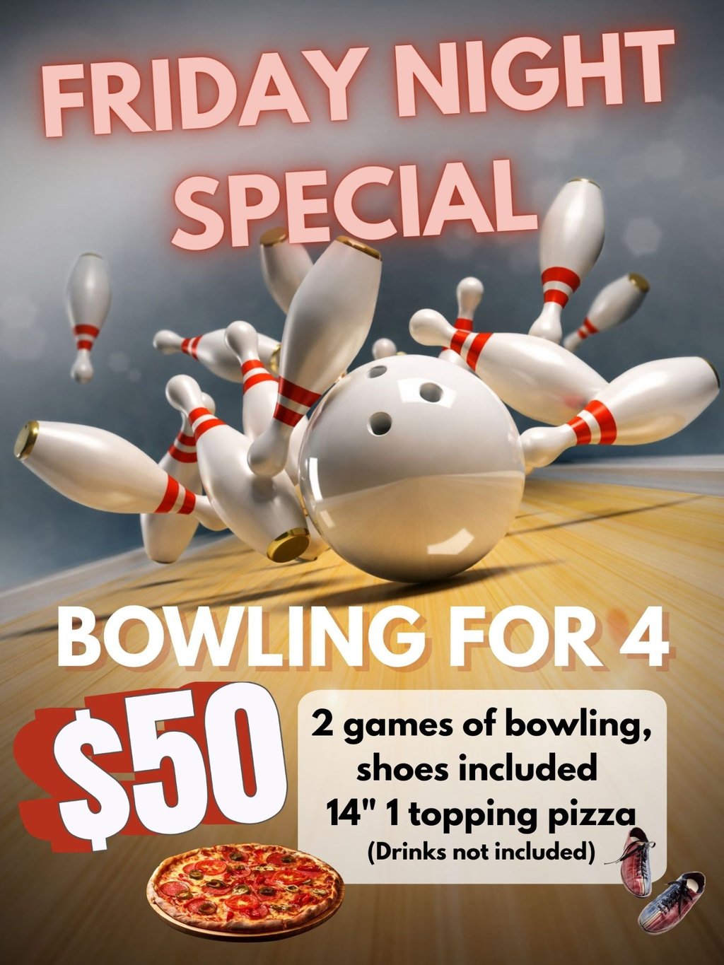 4 people, 2 games of bowling, shoes, 14" 1 topping pizza $50