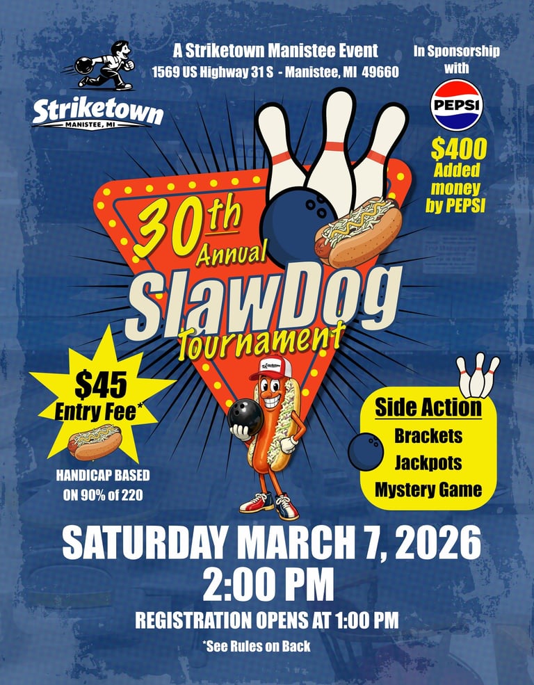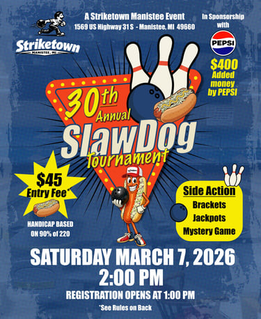 Join us for a day of competitive bowling and exciting side action at the 30th Annual SlawDog Tournament! With $400 in added prize money from PEPSI and a guaranteed 100% return on all prize fees, this is an event you won't want to miss.